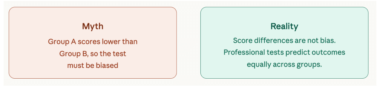 Psychometricians define bias precisely. A test is biased when it measures different things for different groups, or when it predicts outcomes differently across groups β not when average scores differ. Average differences are not, by themselves, proof of bias. Differences can motivate an investigation into bias, but the investigation has to follow from data.