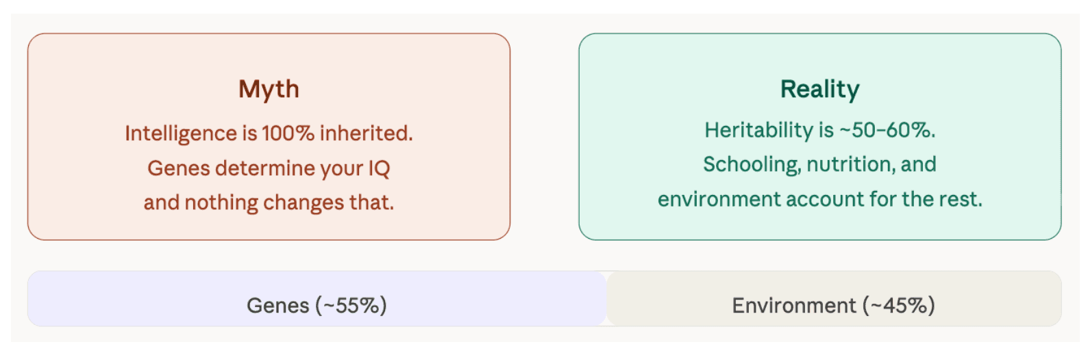 The clearest evidence comes from what we know raises IQ: schooling (roughly one to two points per year), adoption into enriched homes (roughly three points), and the avoidance of known harms like lead exposure and malnutrition. Genes set a range of possible outcomes. Environment determines where within that range a person lands.