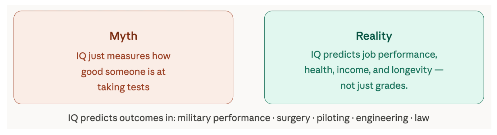 Modern research has confirmed these findings. There are strong associations with occupational attainment, income, health behaviors, and longevity. The military has relied on cognitive ability testing for over a century precisely because IQ predicts trainability and job performance in the field. The same predictive pattern appears across surgery, aviation, engineering, and law. IQ tests look like school tests β questions, time limits, a score at the end. What they measure is something that operates in virtually every domain where clear thinking is required.