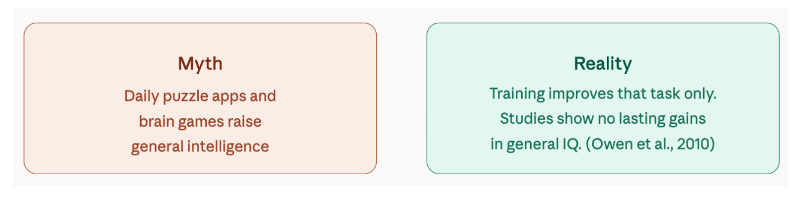 A landmark study testing over 100,000 participants found that people who reported regular brain training showed no advantage over non-trainers on broader measures of intelligence. The skill they practiced got better. General IQ did not move. This does not mean cognitive improvement is impossible. Sustained exposure to genuinely intellectually demanding environments β most reliably, formal schooling β is associated with real gains. A few minutes per day on a matching game is not the same thing.