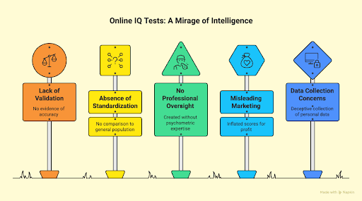 Questionable intelligence tests, especially those found online, share several clear red flags that indicate a lack of scientific rigor and professional backing. The primary feature is often a complete lack of any technical documentation (such as a manual) that describes their creation and validation. This is important because this documentation is essential for the test to be externally evaluated. This evaluation is standard procedure for legitimate psychological tests. Note that the manual may not always be available to the public; access may be limited to testing professionals. But there should be evidence that the manual exists and that outside professionals have examined the test.