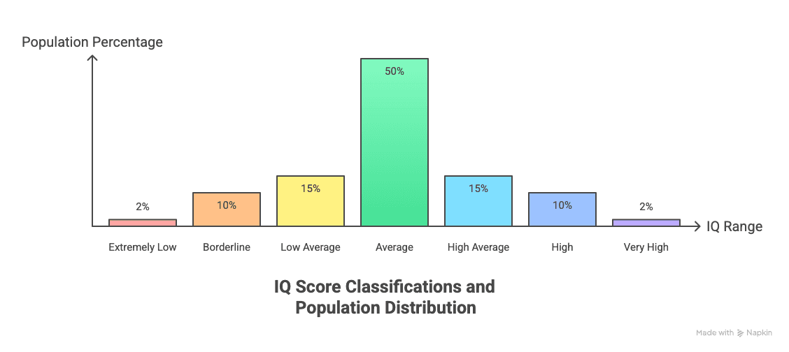 The 90–109 range is where about half the population scores. "Average" is a statistical term here, not a value judgment. It means typical performance compared to same-age peers who took the same test under similar conditions. Many aspects of society are designed for people in the average range of IQ, and most semi-skilled jobs are obtainable by people with IQs between 90 and 109.