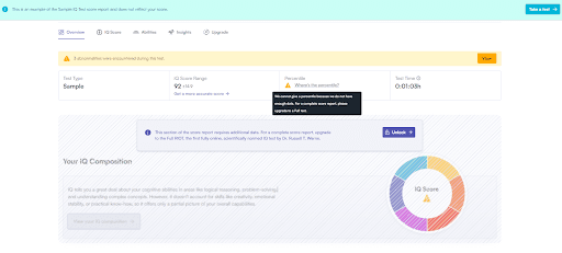 Professional tests go much further by providing subscores across multiple cognitive domains, detailed cognitive profiles showing patterns of strengths and weaknesses, and indicators that flag potential issues with the testing session. Free abbreviated versions naturally cannot provide this level of detail, but they should at least acknowledge the lack of subscores that a more comprehensive assessment would provide.