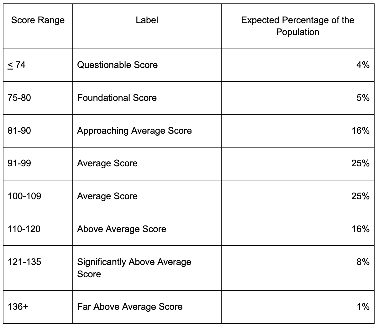 Sometimes the phrase “gifted” is used to label scores. There is universal threshold for when a score is in the “gifted range.” For many experts, the top 2% to 10% of the population can be labeled gifted (which corresponds to IQ minimums of 120 to 130), but others believe a larger percentage of the population can justifiably be called “gifted.” And some experts do not use IQ at all when labeling people as gifted.