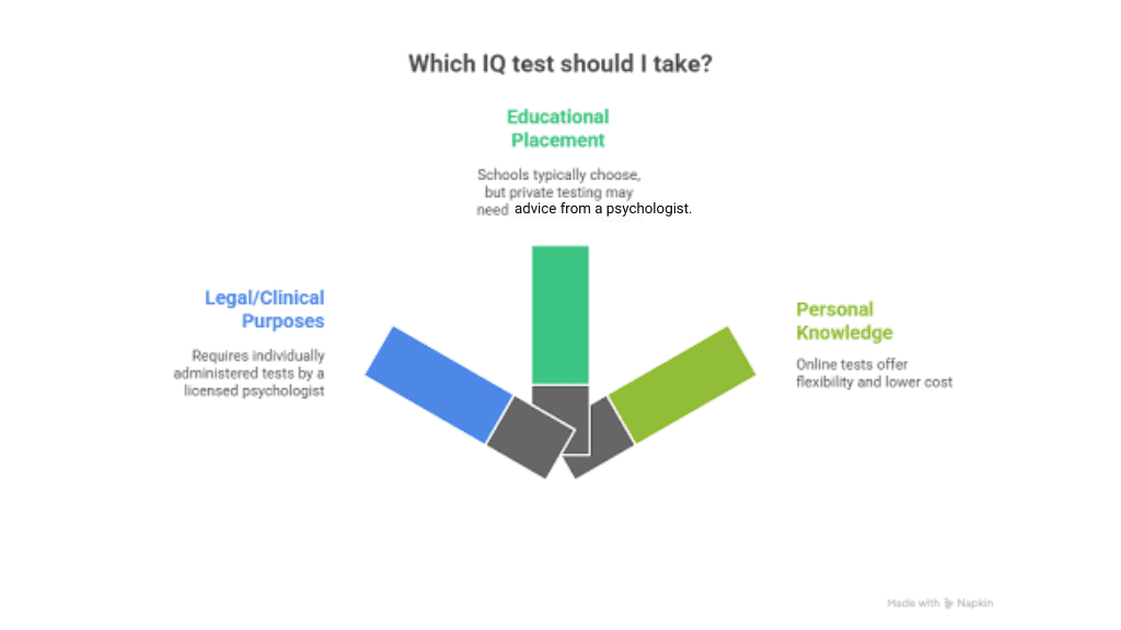 For legal or clinical purposes, you need an individually administered test given by a licensed psychologist. Courts, disability determinations, and clinical diagnoses require this level of professional oversight. Tests like the Wechsler Adult Intelligence Scale (WAIS), Stanford-Binet, or Woodcock-Johnson are standard in these settings.Â