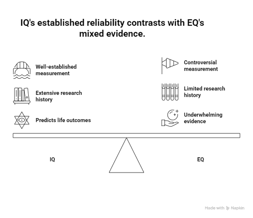 EQ tests do show modest correlations with important outcomes. They predict performance in school and the workplace, typically with correlations ranging from 0 to .25. This is weaker than IQ's predictions for the same outcomes, but it's not nothing. However, these predictions become much weaker or disappear entirely when researchers control for IQ and personality. This suggests that what EQ tests measure is mostly a combination of cognitive ability and personality traits, not a distinct form of intelligence.