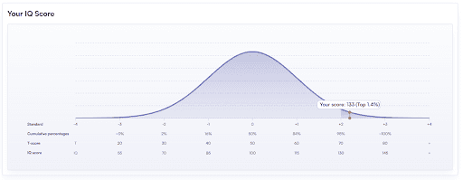 In a deviation IQ system, scores follow a normal distribution (often called a bell curve). About 68% of people score between 85 and 115, and 95% score between 70 and 130. These scores represent how many standard deviations above or below the average a person performed. As an example, here’s how a person’s IQ test results would look like on the RIOT Dashboard. Aside from plotting where your score lies compared to the normed population, the report also produces a detailed breakdown of the examinee’s performance across the different subsections.