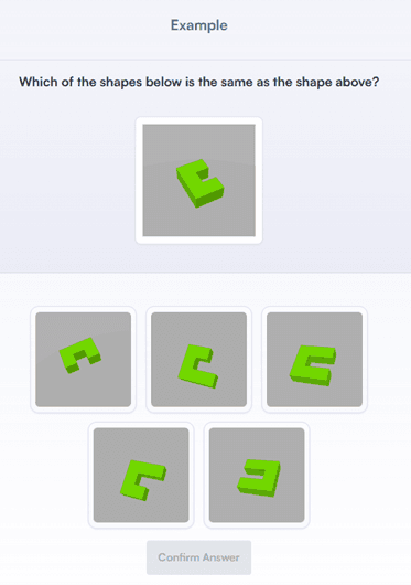 The RIOT tests spatial ability through Object Rotation, SToVeS, and Spatial Orientation tasks. Object Rotation is exactly what it sounds like: the system shows a 3D figure, and the examinee must imagine how it would look if rotated. An example of the Object Rotation subtest is shown here:
